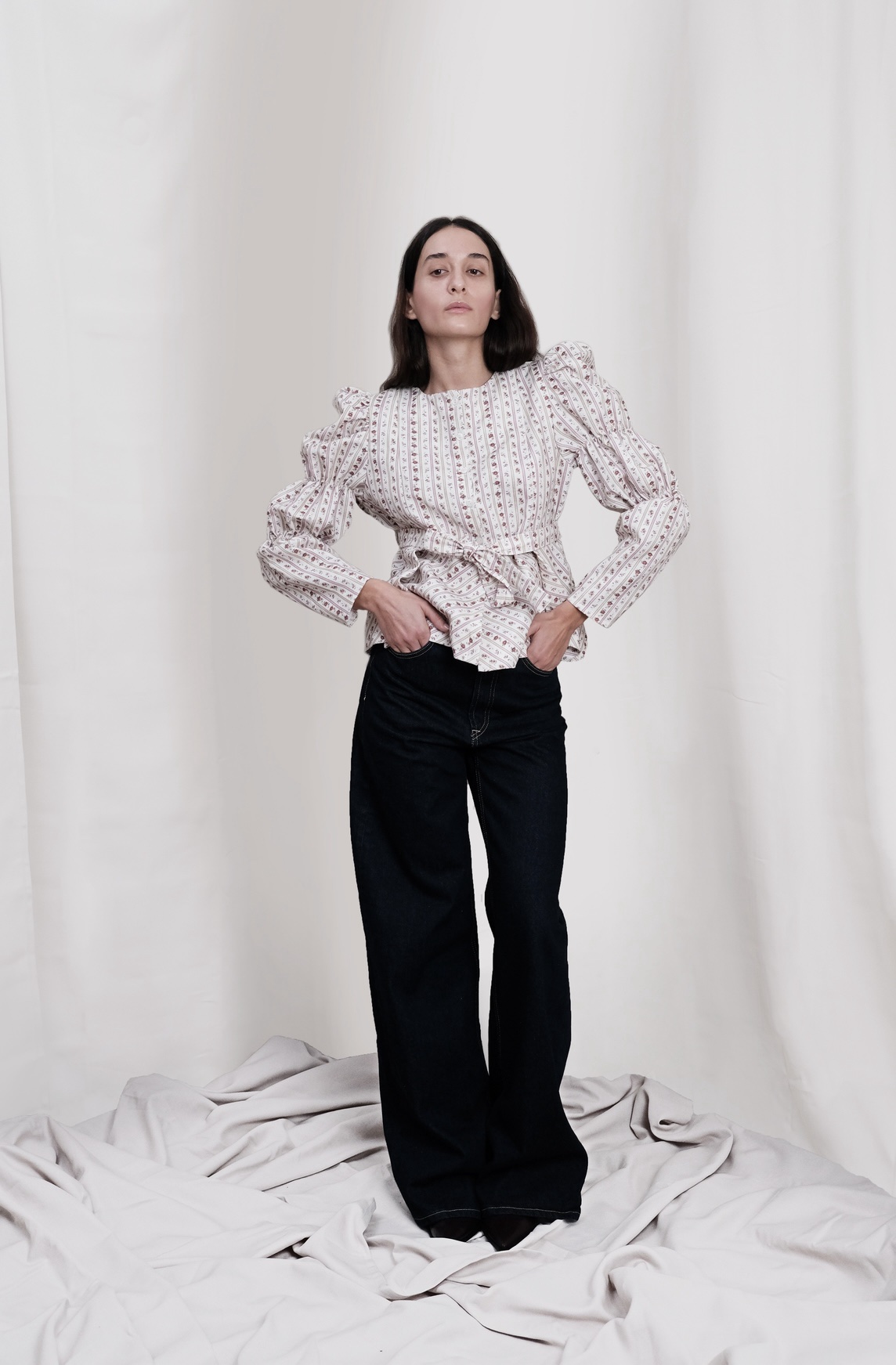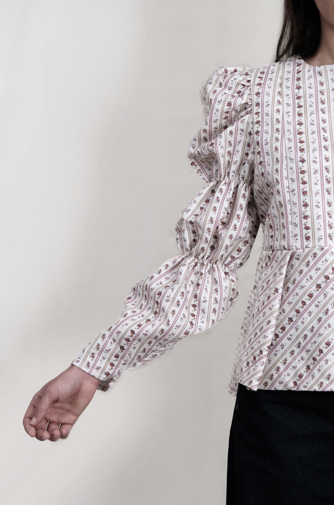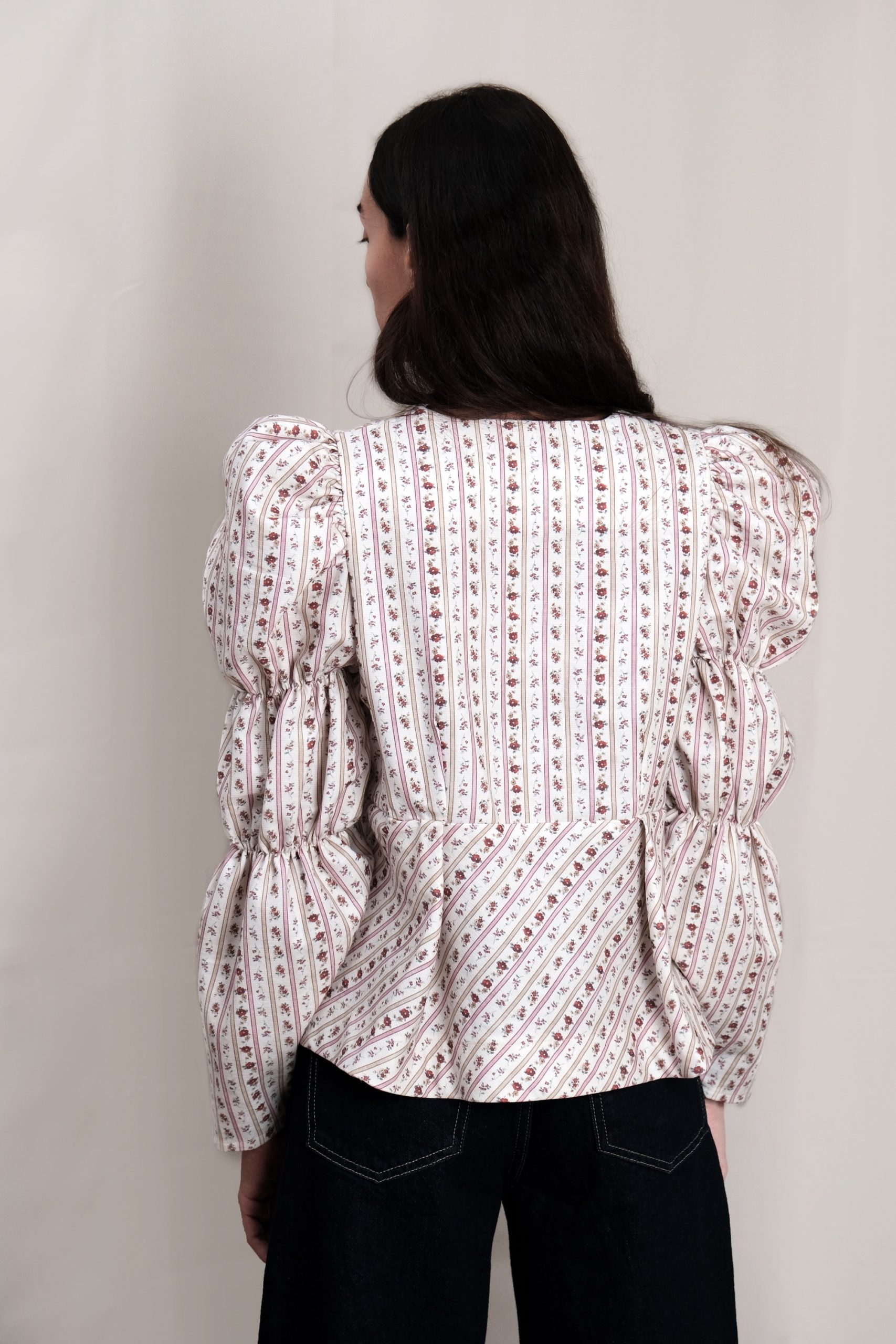 Blusa 100% algodón, peplum, y cuello a la caja. Mangas abullonadas. Botones nacarados. Estampado romántico.
